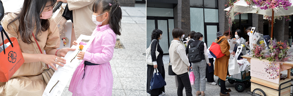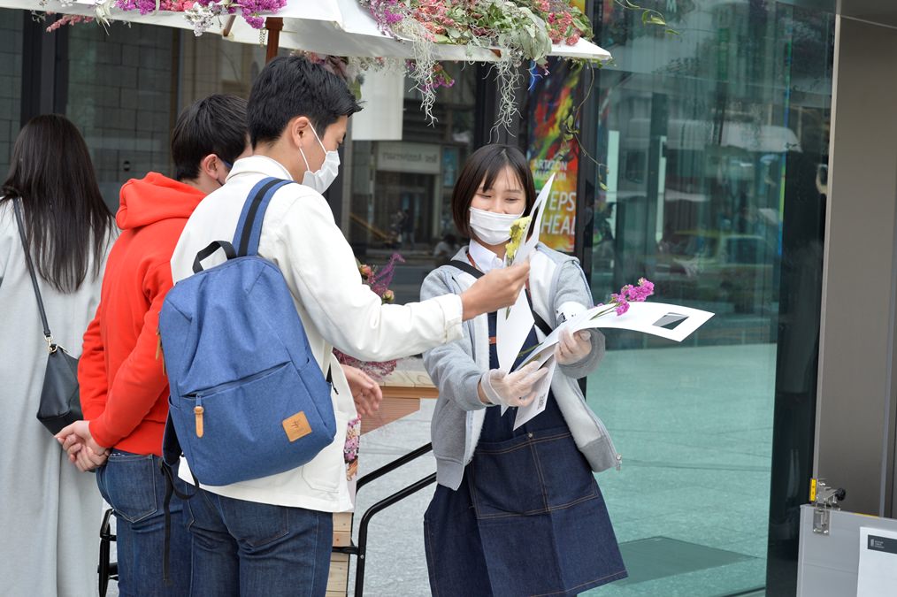 さくら通りは普段から人の往来が多い通りですが、フラワーカートのマグネット効果はここでも健在。入れ替わり立ち替わり訪れる来場者に花をプレゼントするスタッフの、忙しくも楽しそうな様子につられるように来場者の笑顔も広がり、最終的には約1,000本のロスフラワーが配布されました。