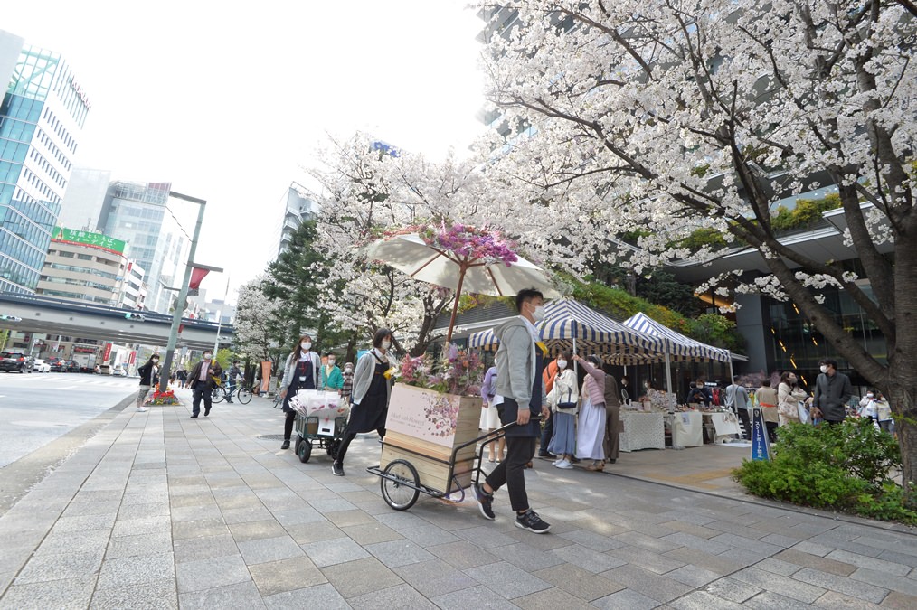 東京スクエアガーデンのシンボルツリーともいえる桜とフラワーカートとのコラボレーション