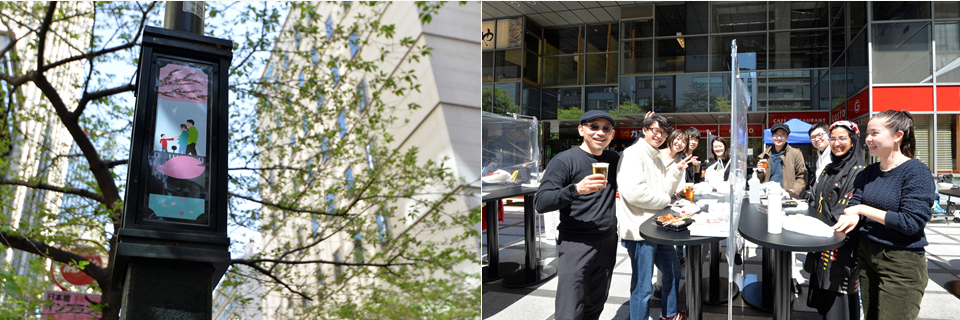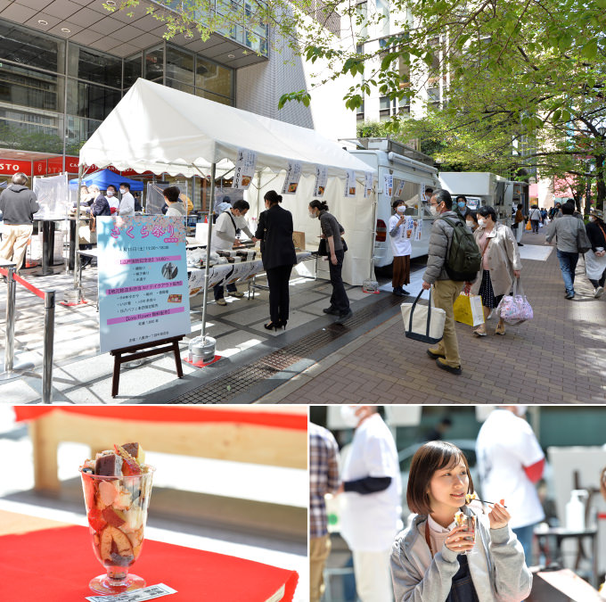 通りに面する日本橋プラザビル1階の南広場をメイン会場に、日本橋六之部連合町会青年部商店会(日八会)が主催する「日八会さくら祭り」は毎年恒例の地域イベントですが、残念ながら、コロナ禍で昨年は中止となり、今年は規模を縮小しての開催となりました。しかし、「やるからには訪れた人を楽しませよう」「少しでも街を盛り上げていこう」と、日八会のメンバーや地元企業の社員が徹底してコロナ感染防止の対策を取り、みんなが安心・安全に楽しめるような創意工夫の詰まったイベントに。
