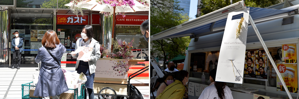 花をテーマにした美術展や期間限定メニューなど、様々なコンテンツが提供された本イベントですが、注目はなんといっても、株式会社RIN(以下、RIN)とのタイアップで実現した、ロスフラワーを使ったインスタレーションでしょう。ロスフラワーとは、規格外であるなどの理由から、まだ美しいのに廃棄されてしまう花のことを指します。それらの花をドライフラワーにして生まれ変わらせる活動を行うRINが、高さ約3メートルものフラワーモニュメントと、街ゆく人々に花をプレゼントしてまわるフラワーカートを制作。気持ちを明るくしてくれる花の力をたくさんの人にシェアしました。