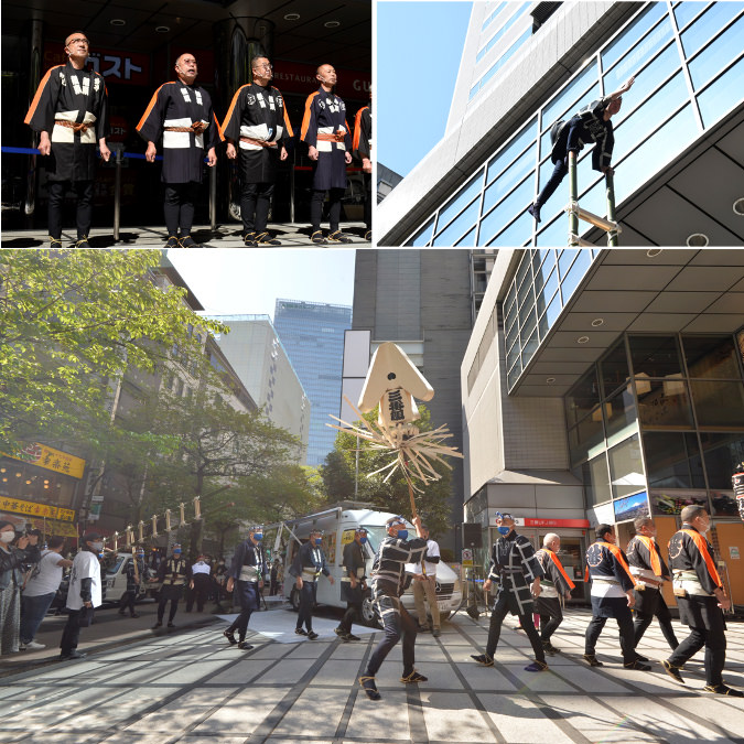 右上)約6メートルもの高さの梯子の上で技を決める、息をのむ瞬間。町を守る火消しの心意気と実力が示されます