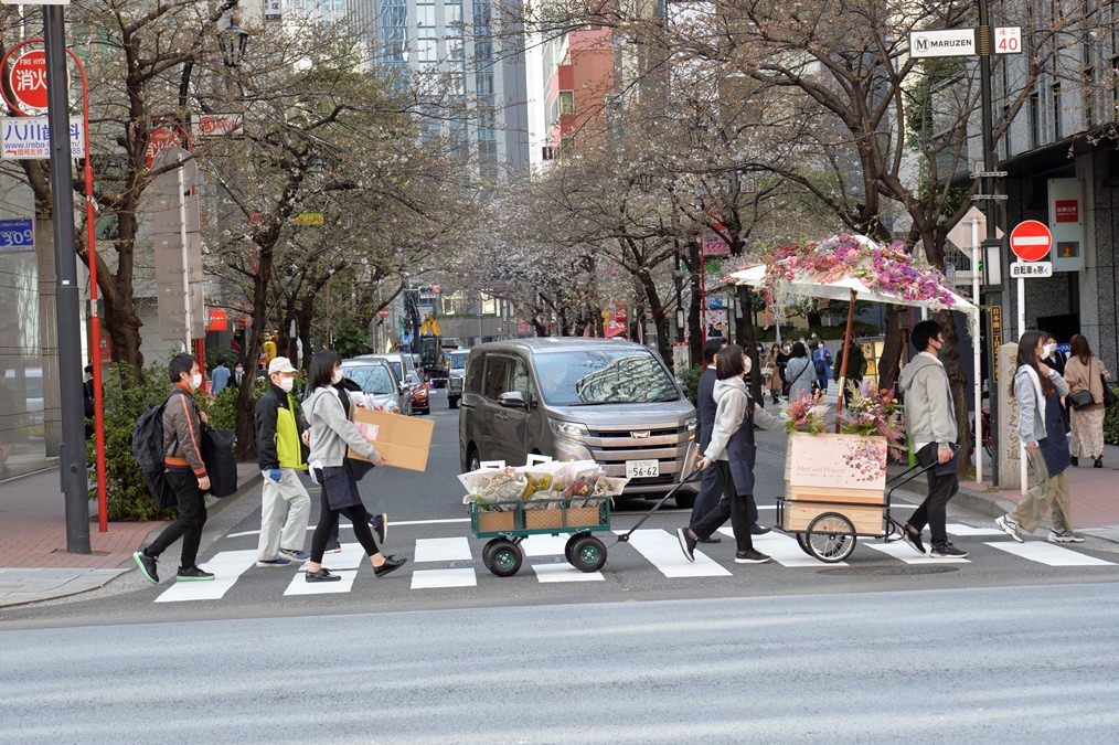 日は変わり、4月10日(土)。フラワーカートの今度の出張先は「日八会さくら祭り」の会場でした。東京駅八重洲北口から茅場町方面へ伸びる「さくら通り」は、文字どおり桜並木が続き、東京駅と日本橋駅をつなぐ通りとして多くの人が利用しています。