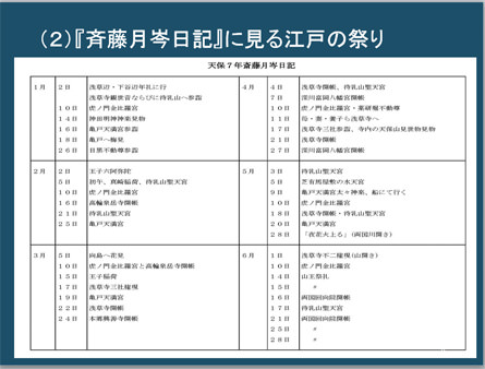 当時の江戸は「ハレ(非日常)の町」と称されるほど、祭りに事欠かない町だったそう。有名なお祭りだと、3月の浅草神社「三社祭」にはじまり、当時東京タワーの近くにあった水天宮の「水天宮祭」、日枝神社の「山王祭」、富岡八幡宮「深川八幡祭り」、神田明神「神田祭」、芝大明神「だらだら祭り」とつづき、ひときわ活気づいたとか。
