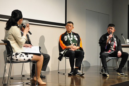 第二回の講師は、江戸東京博物館館長の竹内誠さん。第一回の講師を務めた江戸町火消し「ろ組」組頭の鹿島彰さん、世話役として参加された竹内章雅さんも登場し、かつて江戸の町が「祝祭都市」であったお話をお伺いしました。