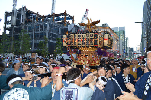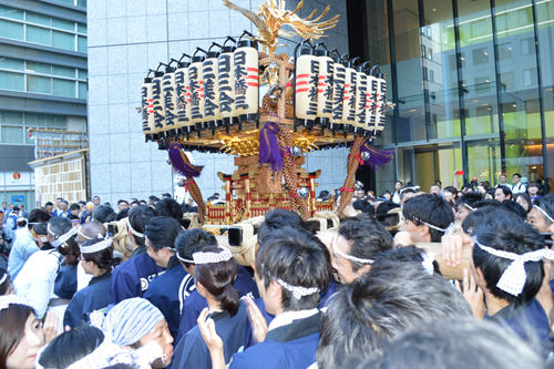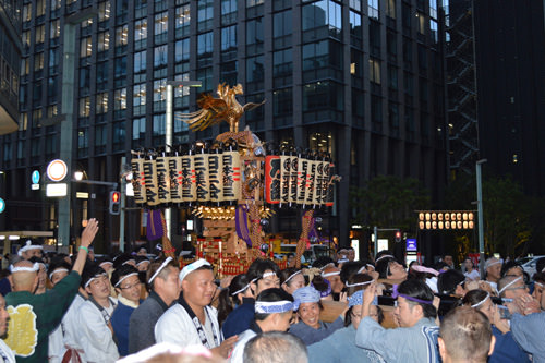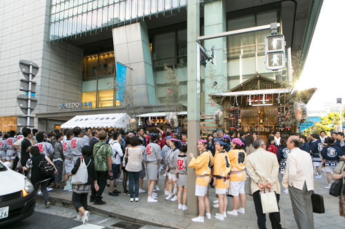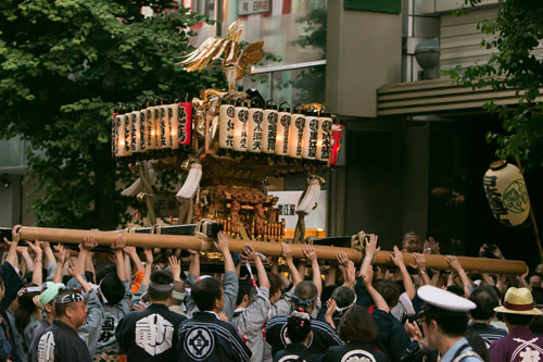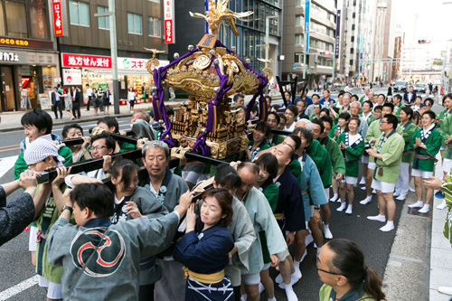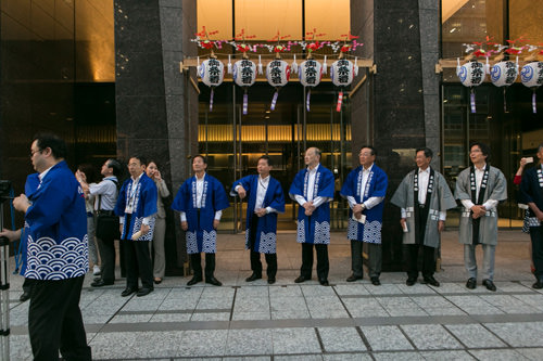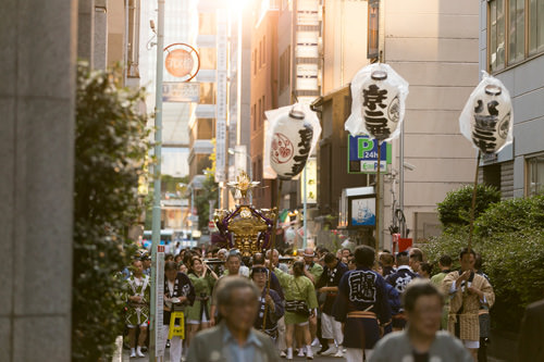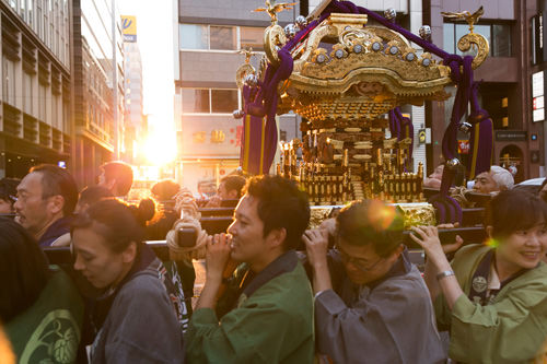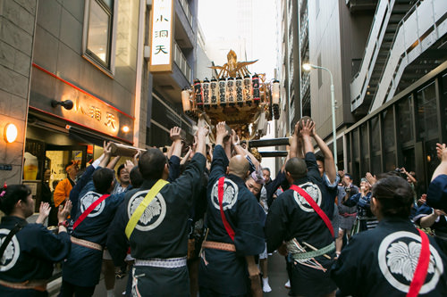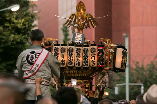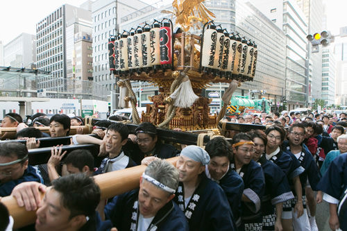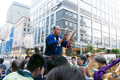 現在東京の都心では町はオフィス街へと姿を変えており、町自体に住まう人はぐんと減っているそう。こうした変化の中で、神輿の担ぎ手としての重要な担い手は、その町で働くオフィスワーカー。昔から地元に住まう人々はもちろん、オフィスワーカーがいつものスーツ姿から半纏に着替え、元気いっぱいに神輿を担ぐことは、この町で働く誇りともいえます。参加されている皆さん揃って笑顔で、山王祭を盛り上げている姿が印象的でした。