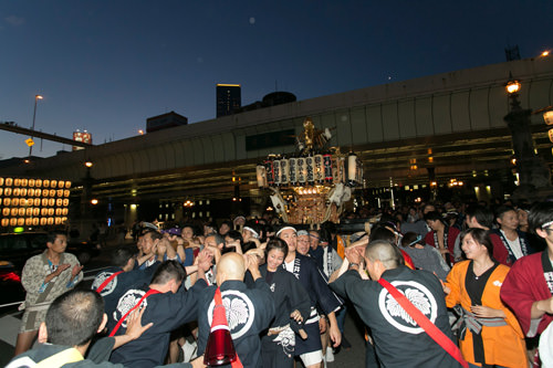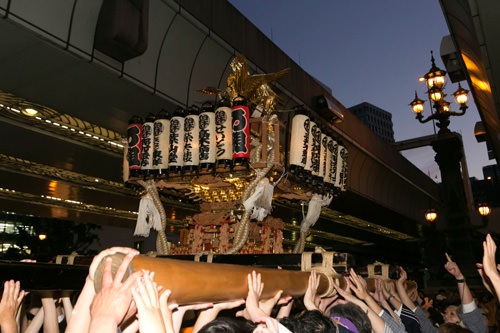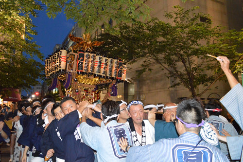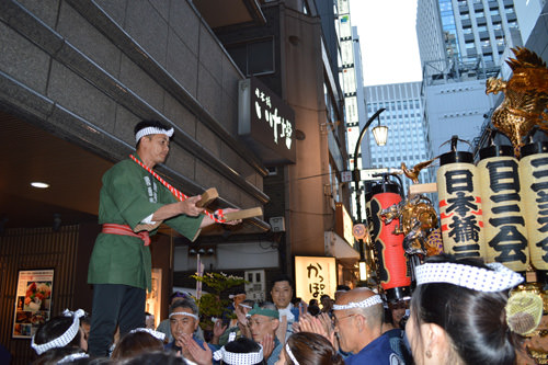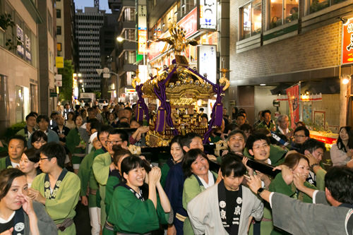 10日に各町を賑わせたのは「宵宮」と呼ばれる夕方から始まる神輿渡御。開始時間の少し前、さまざまな色の半纏をまとった人々が次々と御神酒所に集まります。こんな都会の真ん中に、半纏姿の人が大勢歩いているのも、なんだか不思議な景色です。町会の半纏はもちろん、その町にある企業の名前が入った半纏もあり、思っていた以上に種類がありました。半纏を着て、キリリと鉢巻を締めている姿は粋で恰好がよく、思わず見惚れてしまいます。