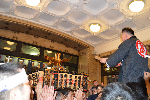 神輿渡御の見せ場のひとつが、地元の旦那衆のもとを訪れ、神輿を差し上げ挨拶する表敬訪問。各ビルや店の玄関先まで来ると、方向を変え、出迎える旦那衆の眼前に進み、神輿を天に向かって高々と上げる「神輿を差す」儀式が、神輿で挨拶することだそう。日頃からなじみ深い方々からの出迎えを受けて、高々と神輿を差し、挨拶が行われ、拍手喝采が起きました。
