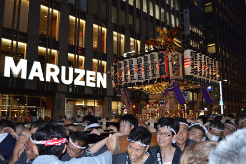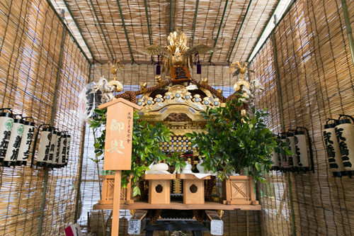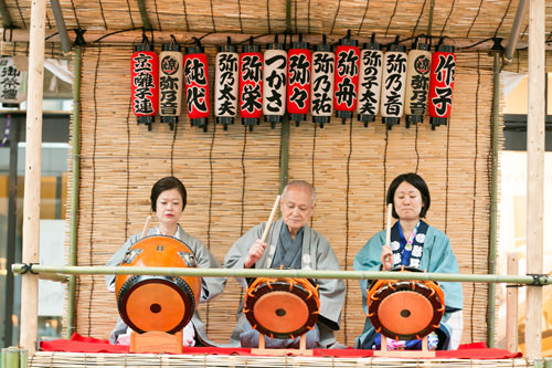 時間になると、御神酒所にて町会長さんのご挨拶から始まり、皆揃って一本締め。いよいよ渡御の始まりです。軽妙なお囃子と高張提灯の列に続いて、神輿が出発。威勢のよい担ぎ声が響きわたり、自然と見物客の気持ちも高まります。いつも見慣れた街に、壮麗な神輿が進んでゆき、別世界のような光景が広がりました。