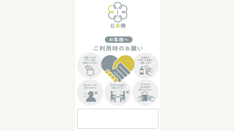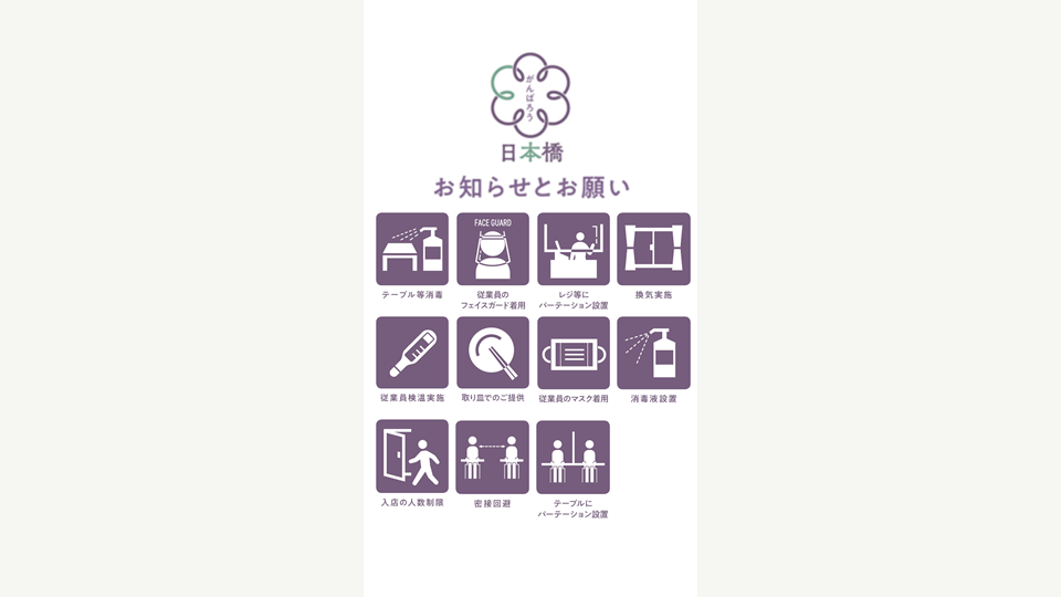 そこで地元企業と飲食店主らが集まって作成したのが、このピクトサイン入りの「お知らせとお願い」「ご利用時のお願い」などのフォーマットです。地域が一体となって感染防止対策に取り組んでいることは、来街者の皆様にも安心感を与えるものだと思います。