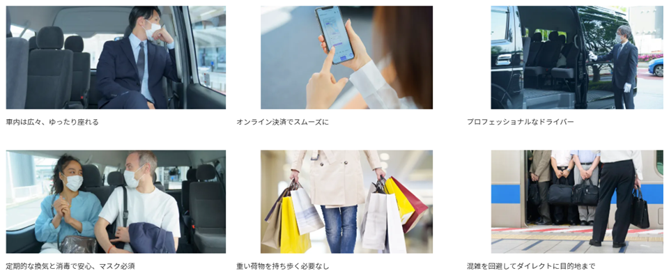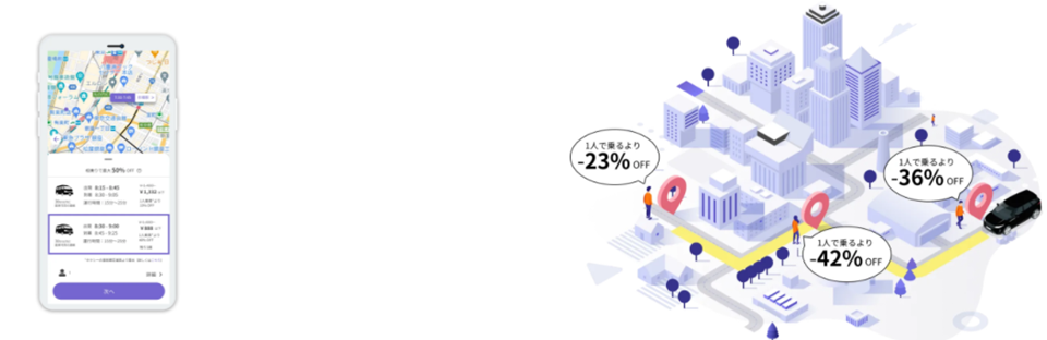 ・料金:相乗り通達内容に沿って料金を算出、一人でタクシーに乗車するより最大50%お得