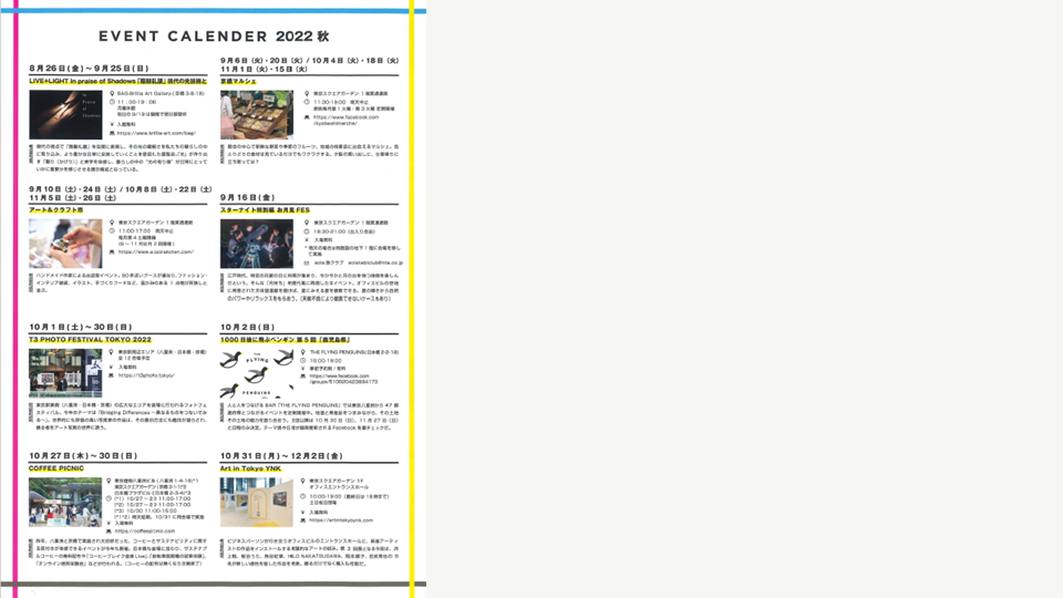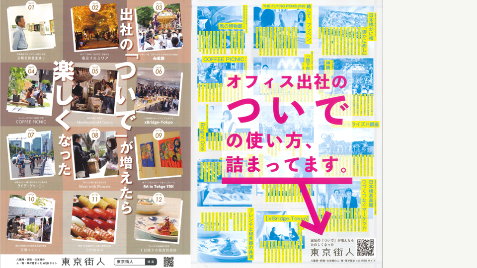 東京街人のフライヤーを公開いたしました。 今後も、八重洲・日本橋・京橋内で開催されるイベント情報を一覧(イベントカレンダー)形式で随時まとめていきます。 第1弾は、秋のイベント情報です。 どこでどんなイベントがあるのかがひと目で分かるようになっていますので、 今まで知らなかったイベントや、街の魅力がきっと見つかります。 なお、お出かけ前に最新の公式情報を、必ずご確認ください。