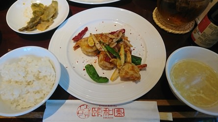 週替わりの麺(→クリーミー坦々麺)に+α(→青椒肉絲)を注文。一緒に行った先輩が迷わずスープを飲み干す美味しさです。