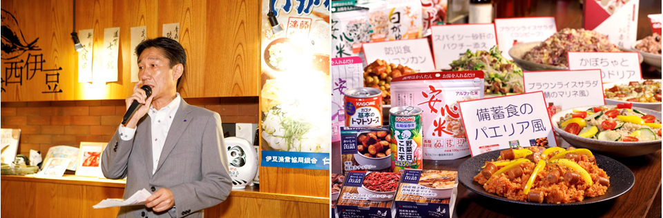 左)アルファー食品のプレゼン。新しい備蓄法『ローリングストック法』が紹介される