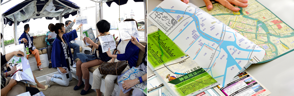 「江戸の暮らしを想像するのは難しいと思われるかもしれませんが、古地図を見ると意外なほどよく知った地名や町名、川の名前や橋の名前を見つけることができます。半透明の現代地図を古地図の上に重ね合わせた特製のルートマップを用意し、観光ガイドを通じて、現代に続く江戸の掘割の姿を蘇らせる工夫をしています」。