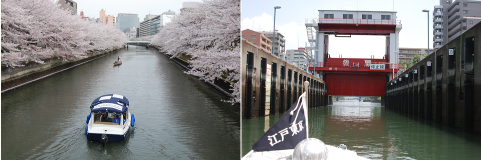 右)隅田川から「塩の道」とも呼ばれた小名木川の扇橋閘門(水位の違う水路を通る際の装置)を体験できる小名木川コース