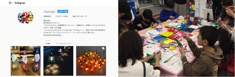 右)手芸店などの店頭でワークショップを繰り返し行い、「オリエステルおりがみ」の認知度をコツコツと高めていった