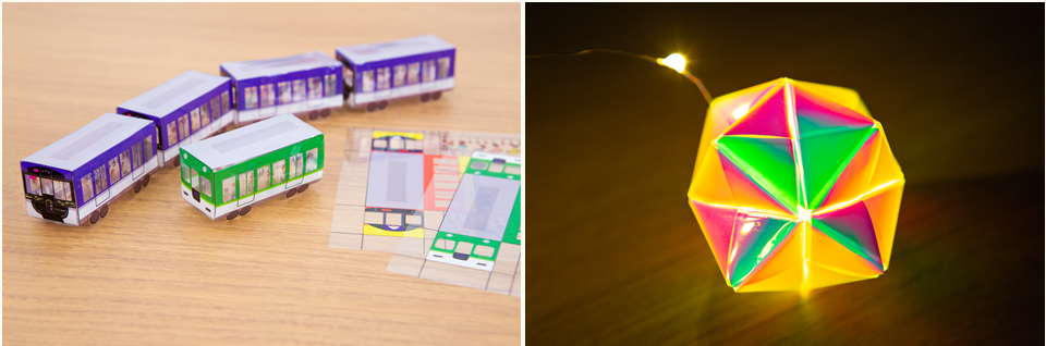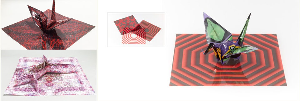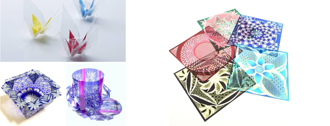 左下)東洋紡オリジナルの切子デザインの「オリエステルおりがみ」を使った作品例