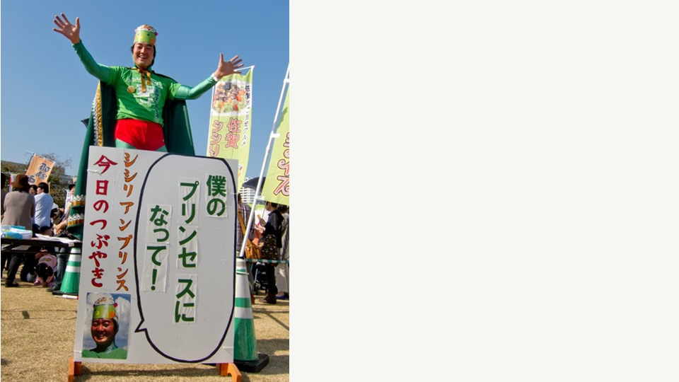 「シシリアンライスは、調味料にマヨネーズを使うことから、単なる町おこしだけでなく、マヨネーズの販促にもつながると考えた企画です。ちなみに自分が“王子”となったのは、ゆるキャラを造る費用がなかったことから出た、苦肉の策でした(笑)。生身なので生キャラです」。