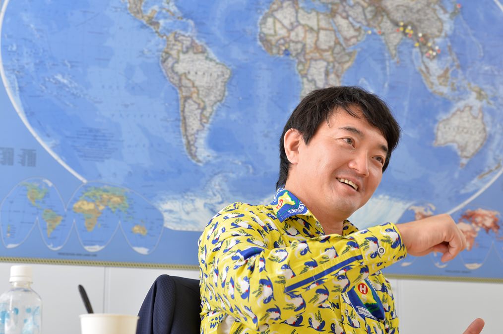 大学時代はアメフトのプレーヤーだったという高橋さん。勤務先だった佐賀では、大学のヘッドコーチや監督も務めていたという。現在は黄色が鮮やかなココプラスシャツがトレードマークだ