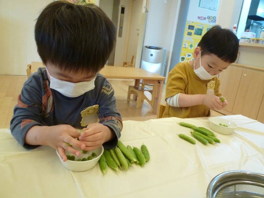 グリンピースの皮むきをお手伝い中の子どもたち。とても楽しんでもくもくと実を取り出していました