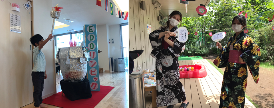 「開園してすぐの昨年は、コロナ禍でほとんどの行事ができなかったのですが、今年度は感染対策をしながらできる範囲で行っています。東京オリンピック、パラリンピックがあったので運動会を『EDOリンピック』と名付け、聖火台に布などで作った火をつける演出も。子どもたちはオリンピックに興味津々になり、普段の保育でも地球儀や世界地図を見たり、国旗のぬり絵で遊んだり、自然に学んでいましたね。