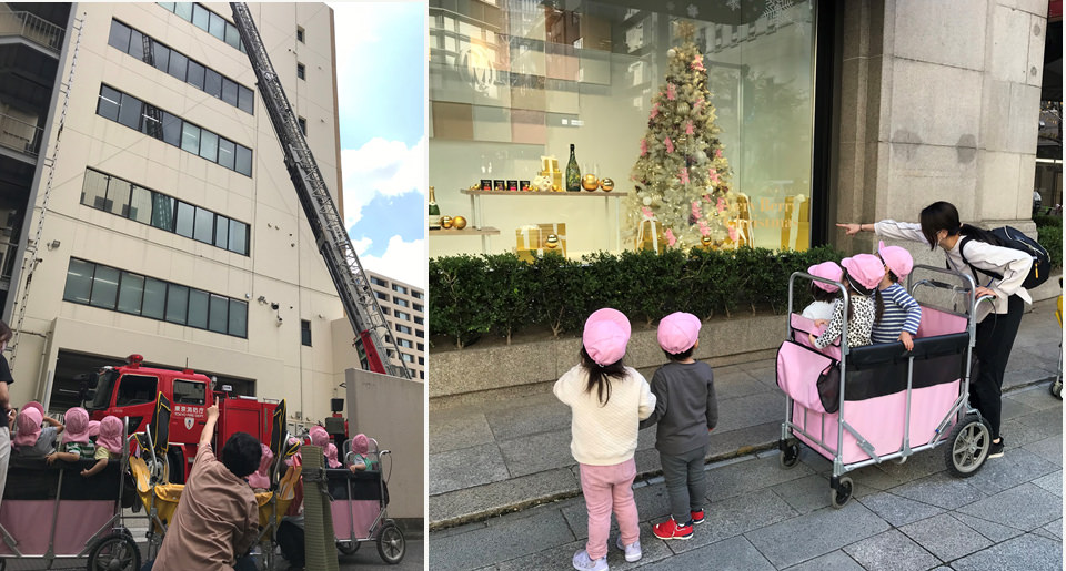 「高層ビル街にはスーツを着たオフィスワーカーの皆さんがいて、子どもたちがいると気づいて手を振ってくれることも。髙島屋が近いので屋上のバラ園まで行ったり、日本橋三丁目交差点の麒麟の銅像を見に行くこともあります。この時期、大きなクリスマスツリーやきれいなイルミネーションが見られるのも、都心ならではですよね。