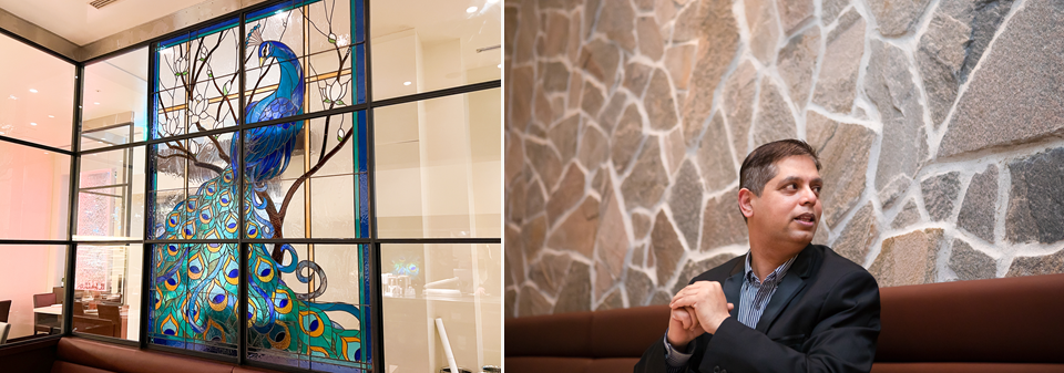 左)店の個室に設置された、巨大な孔雀のステンドグラス