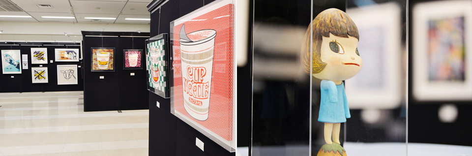 左)日本画家・高村総二郎氏の代表作「カップヌードル」 右)奈良美智氏の立体作品