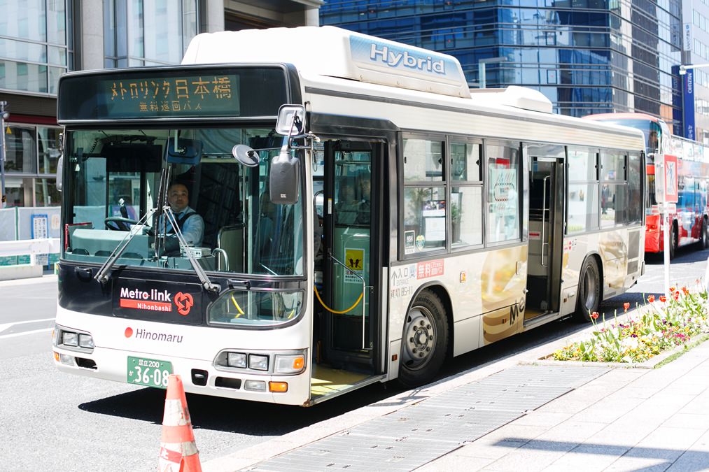 日本橋エリアを中心に巡回する「メトロリンク日本橋」は、誰でも利用できる無料の循環バス。14カ所の停留所を、約10分間隔で運行しています。