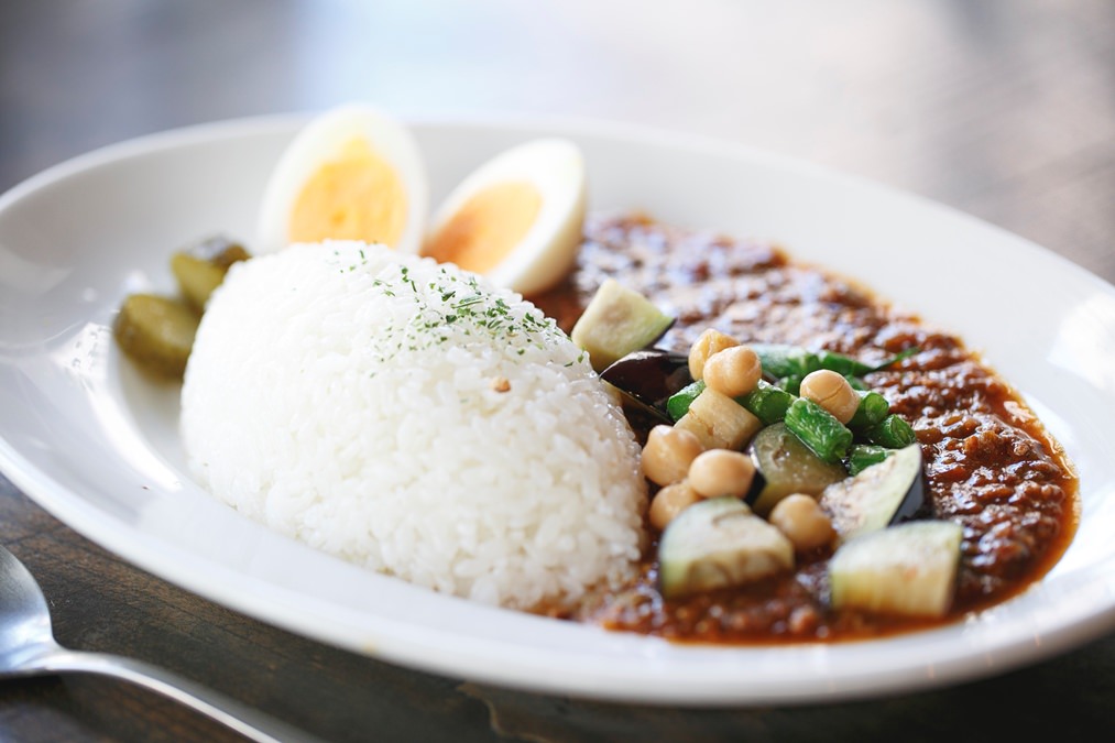 ナスやインゲンがトッピングされたカレーは、あっさりしながらもオリジナルブレンドのスパイスをしっかり感じられる味わい。「17時までランチ営業をしているので立ち寄りやすいです。夜に来たときは、お酒を飲んだ後に食べるのもまたおいしいですね」と、顔がほころびます。