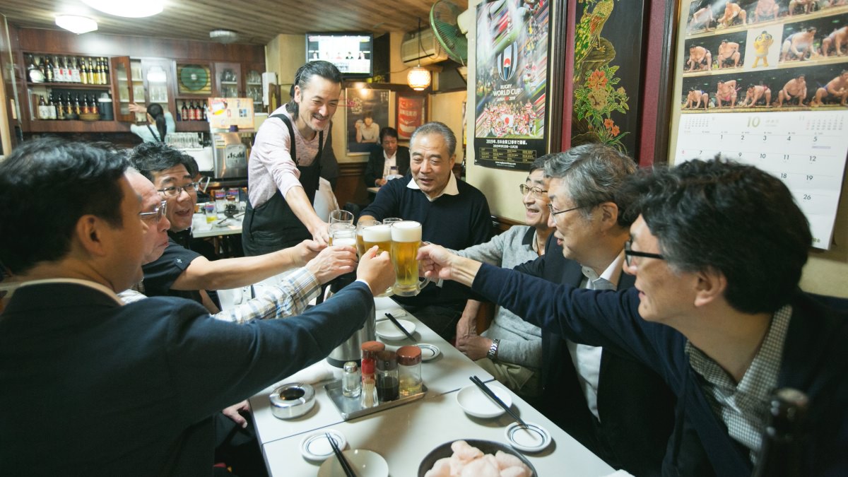 少し雨が降っていましたが、パトロールは無事終了。緑の防災ベストを脱いだ「京橋はじめ会」の皆さんは、打ち上げのため再び「三喜屋」へ。仕事中の友野さんも一時同席して、みんなで乾杯! こうした飲み会が、地域の情報交換の場にもなっているそうです。