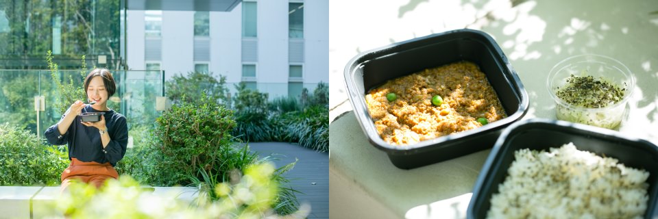 日々アクティブに働く岡野さんの元気の源は、大好きなカレーを食べ歩くこと。この日は、テイクアウト専門店「無添加 グルテンフリー 京橋屋カレー」をチョイス。出張を頑張ったあとのご褒美カレーなのだそう。東京スクエアガーデンの植樹スペース「京橋の丘」でいただきます。