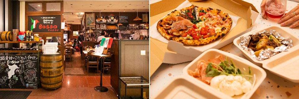 左)「THE FLYING PENGUINS」から徒歩1分ほど、東京建物八重洲ビルの飲食ゾーン「八重仲ダイニング」の中にあるBOSSO。味に定評があり、店内もお客さんでいっぱい