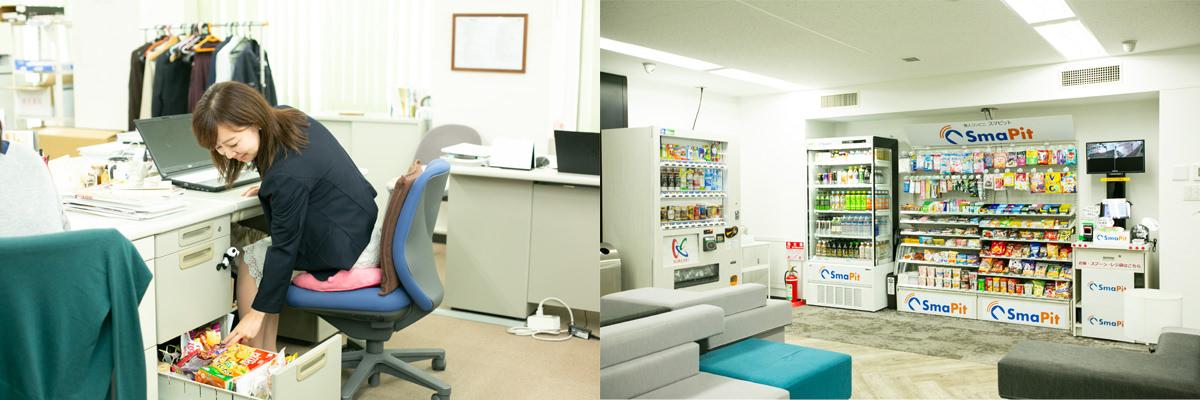 右)コンビニエンスストアのチェーン運営も手がける国分グループ。最近は、無人店舗「SmaPit(スマピット)」の展開も手がけている。国分グループ本社にも設置され、社外に出ずとも必要なものが手に入ると好評だ
