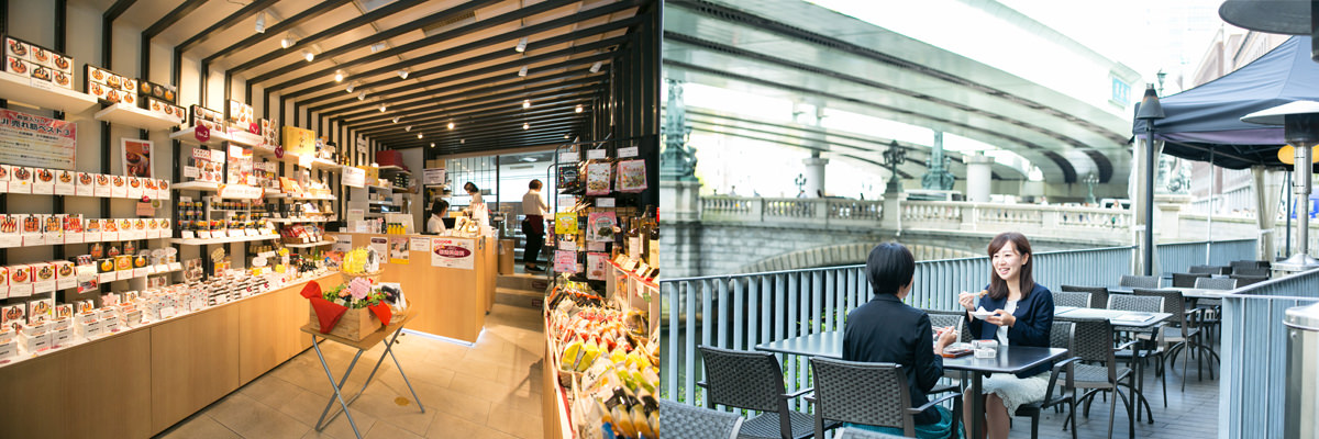 右)「ニホンバシ イチノイチノイチ」のテラス席。日本橋を見ながら缶詰を楽しむことができる